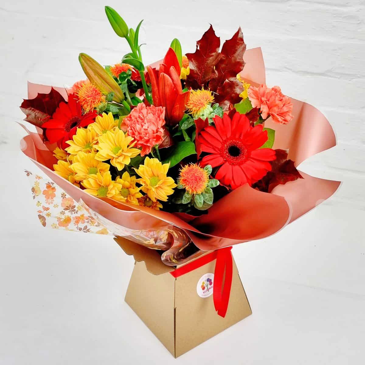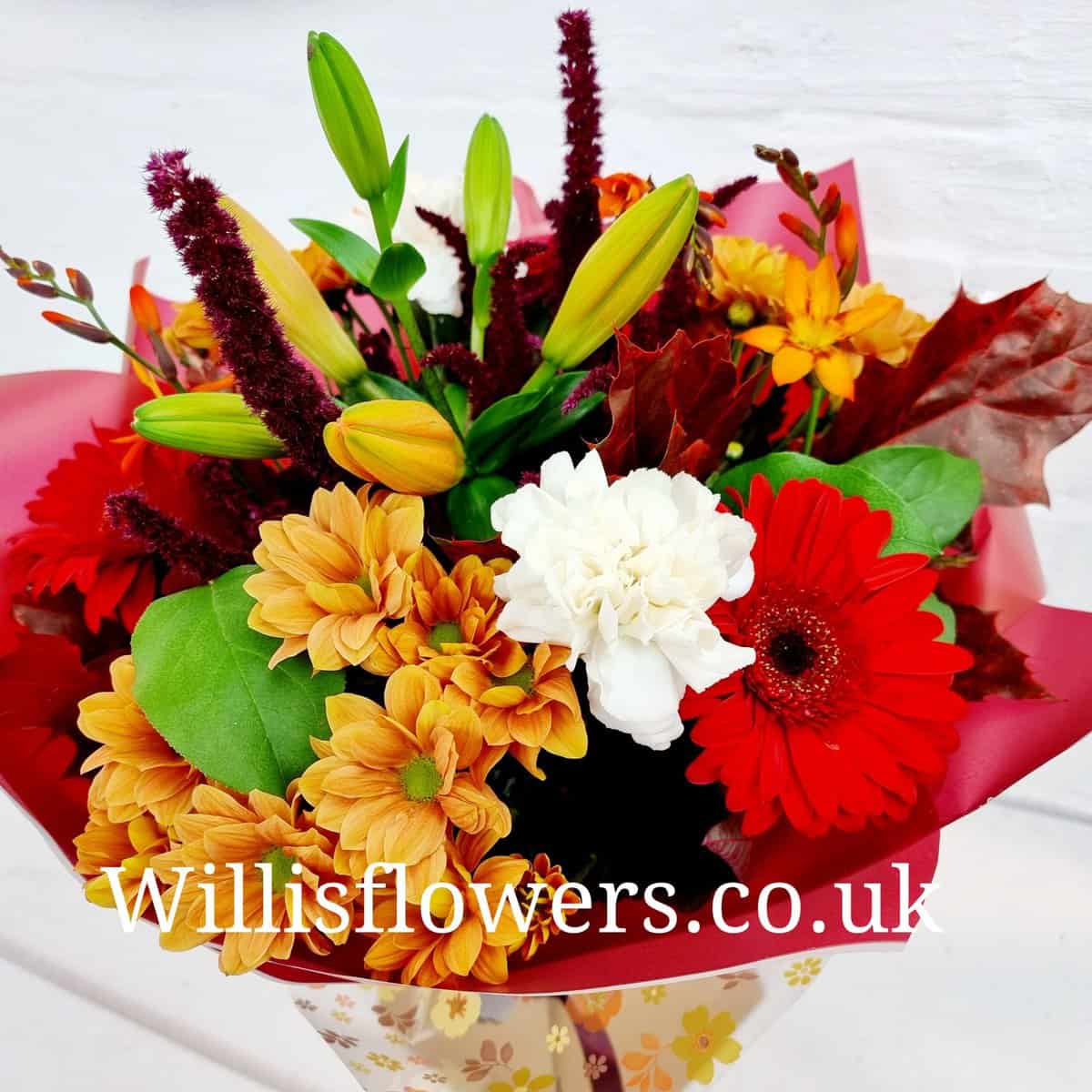 Featuring Red gerbera, red Asiatic lily, red oak leaves, orange chrysanthemums, other seasonal varieties and hand-tied with salal.