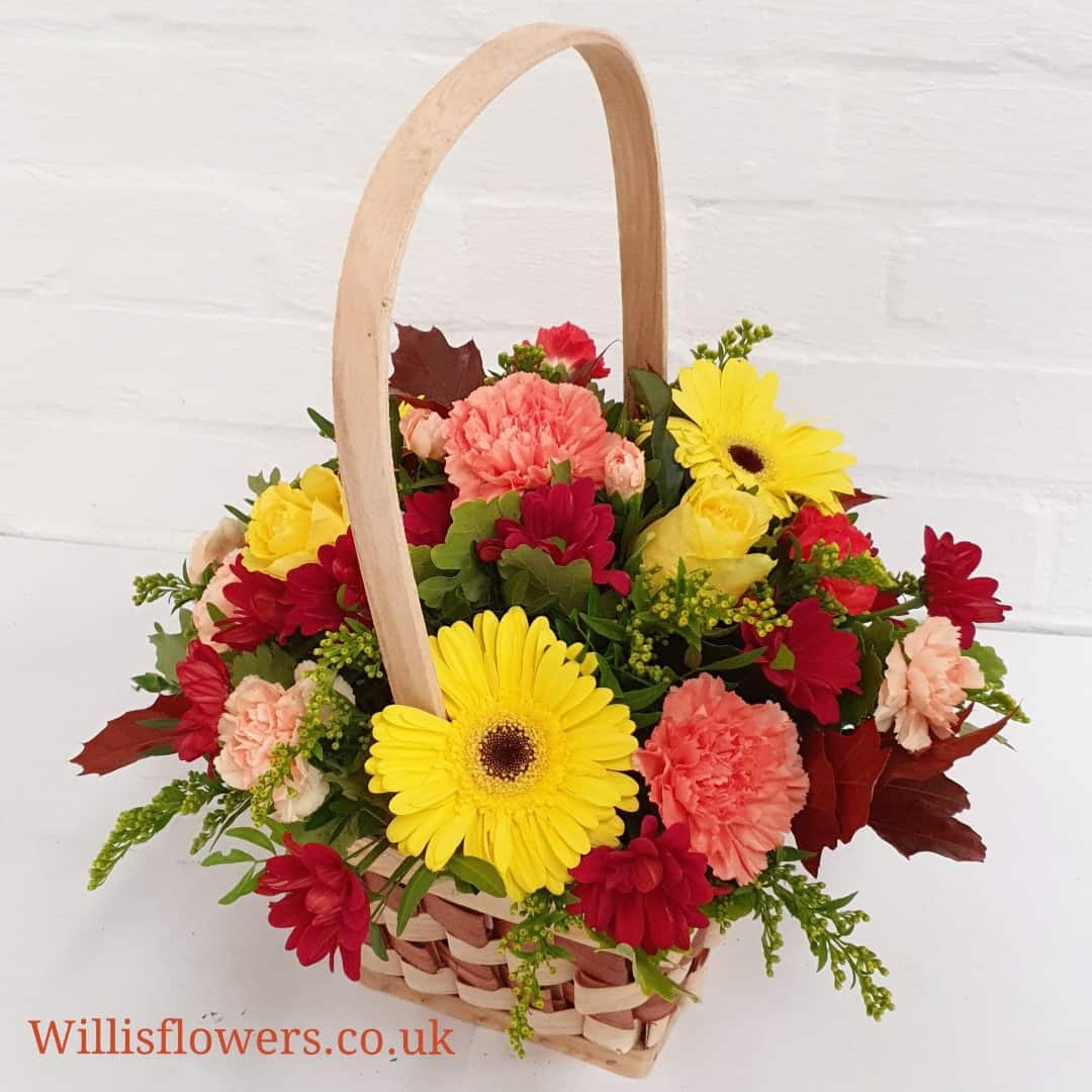 Featuring yellow germini, peach spray carnations, red chrysantamums, yellow large headed rose, orange carnation with Yellow solidaster and foliage, presented in a square woven softwood basket.