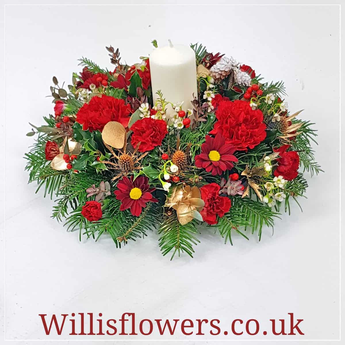 Featuring a Large Church Candle, Red Carnations & Spray carnation, Thistles, Gold Eucalyptus, Fresh holly and a mix of Christmas foliage.