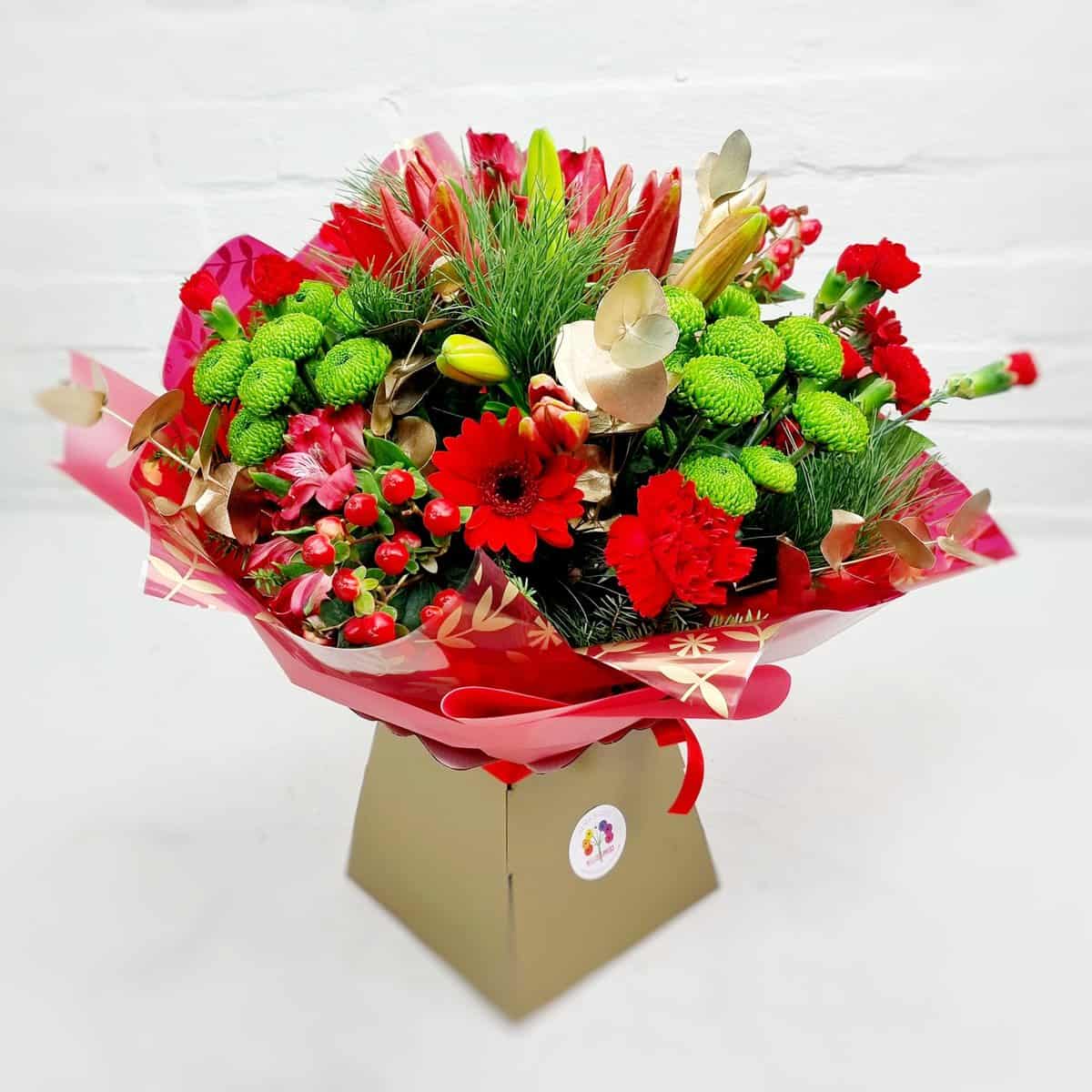 Featuring Red Asiatic lily, Red Carnation, Red Hypericum, Red Alstroemeria, Green Chrysanthemum, Red Germini, a Gold Eucalyptus and complimented with a Mix of Seasonal foliage.
