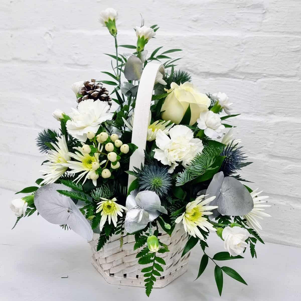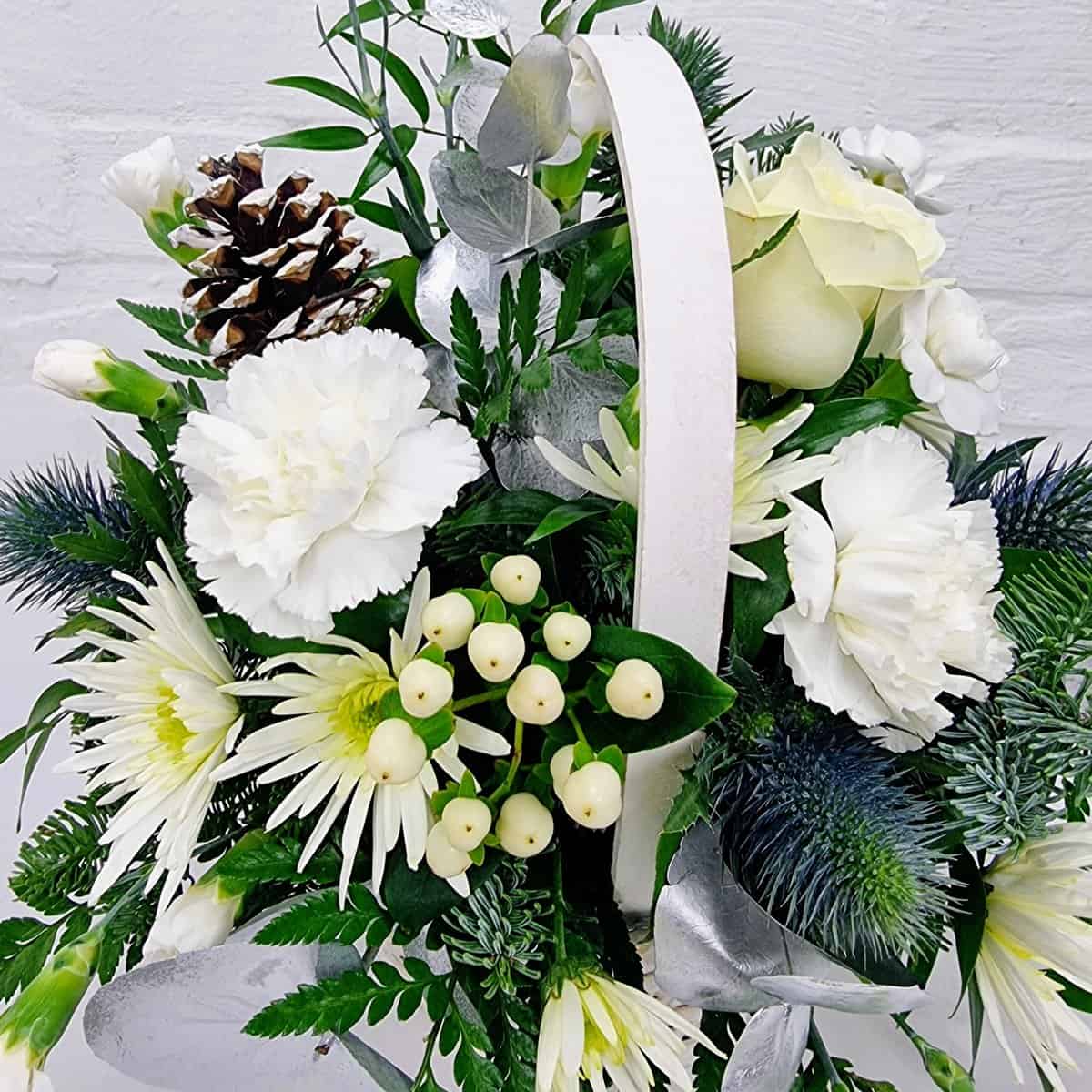 Featuring White Rose, White Carnation & Spray Carnation, Spider Chrysanthemum, Hypericum Berries, Blue Thistle a Pine Cone Pick and a Selection of festive Foliage, presented in a square white woven softwood basket.