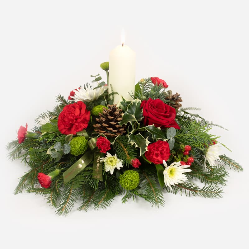 Featuring a Large Church Candle, Red Carnations & Spray carnation, Thistles, Gold Eucalyptus, Fresh holly and a mix of Christmas foliage.